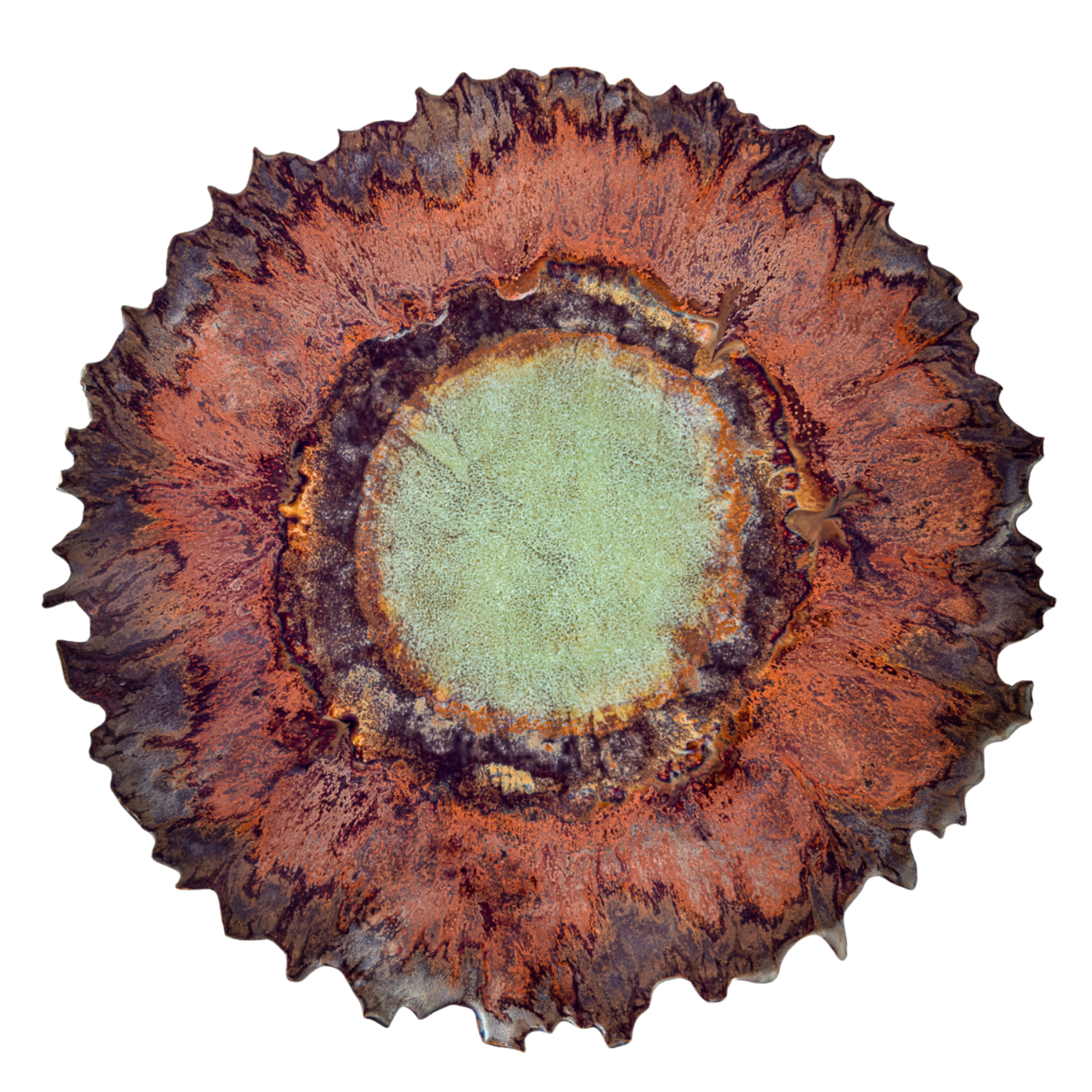 The canvas-like vessel forms used here serve as containment rather than destination. Their role is to hold space for movement — to frame shifting glaze, layered oxides, and mineral reactions as they unfold. These forms provide enough structure to focus the eye, while remaining quiet enough to let the surface speak.